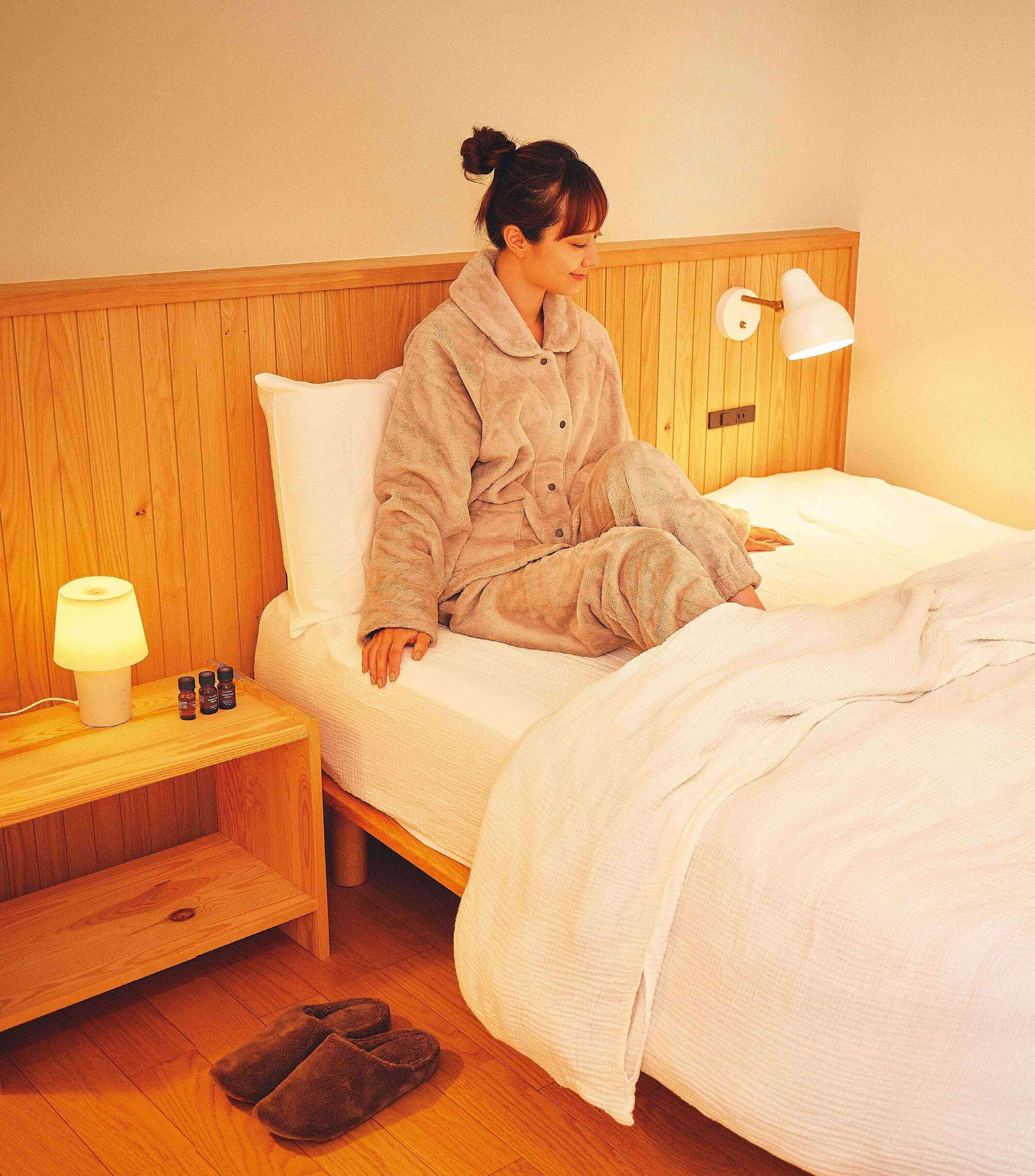 良質な睡眠を得るうえで、大切なポイントが二つ。一つめは、寝る前から深部体温(内臓など身体内部の温度)を低下させること。入浴によって末端の血流をよくしておくと、手足から放熱して深部体温が下がり、スムーズに眠りにつくことが期待できます。二つめは、交感神経を低下させて副交感神経を優位にすること。照明を暗くすることで眠りを促すメラトニンが分泌し、心拍数が低下。リラックスが期待できる天然精油の香りを嗅ぐのもおすすめです。