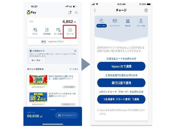 VポイントPayアプリを開いて、VポイントPayアプリとV会員番号を連携したら、貯まったVポイントを使ってVポイントPayアプリにチャージします。