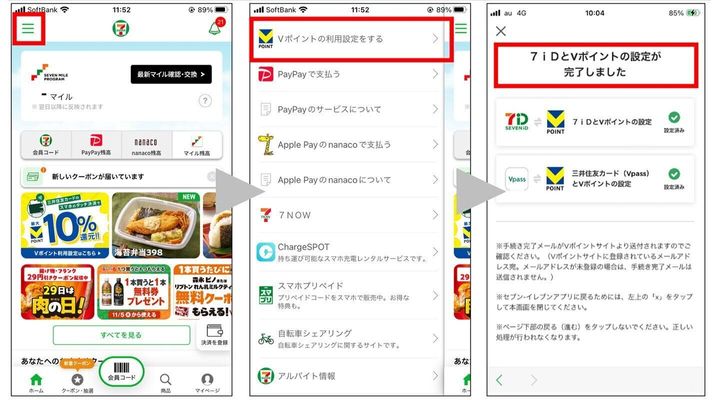まずはセブン-イレブンアプリをダウンロード。アプリを開いたら左上の3本線(メニュー)から、「Vポイントの利用設定をする」をタップしてください。