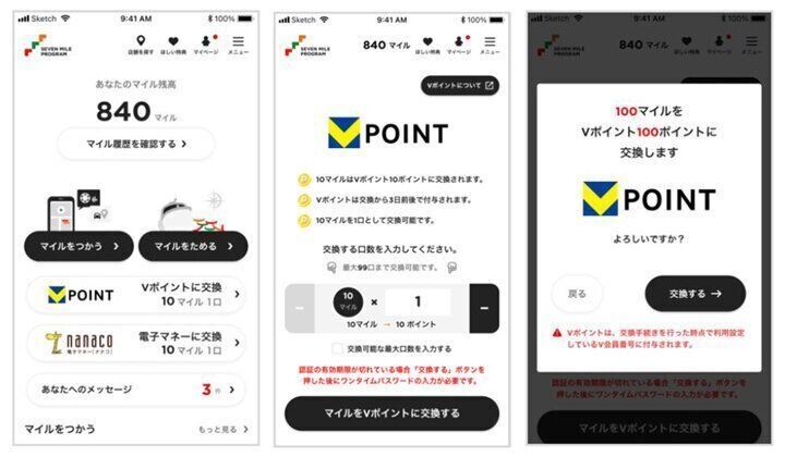 セブンマイルはさまざまな特典に交換できます。さらにセブンマイルをVポイントに交換もできるんです。