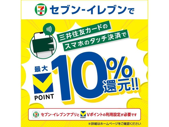 全国のセブン-イレブンでVポイントがさらに貯まる新サービスです。これまでの三井住友カードのスマホのタッチ決済で7%のポイント還元だったものがこの新サービスでは最大10%還元へパワーアップ!