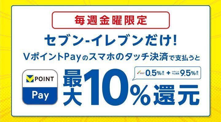 毎週金曜日はVポイントPayアプリでのスマホのタッチ決済で最大10%還元。これはセブン-イレブン限定のサービス。利用しない手はないですよね。まずはVポイントPayアプリをダウンロードしてください。利用方法はこちらもカンタン!