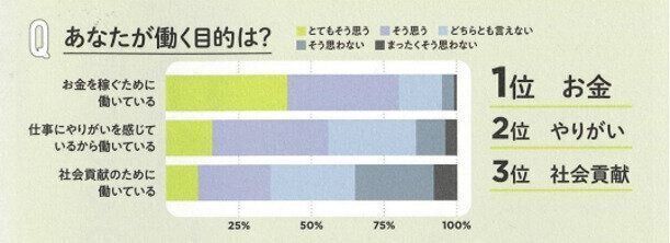 ■山本「働く目的を“お金・やりがい・社会貢献”の3つに絞り、それぞれ質問したTOP2BOXの結果です。8割くらいの人がお金のためと答えていて、仕事のやりがいと答えているかたも過半数、社会貢献のためというかたも約3割、という感じでした」