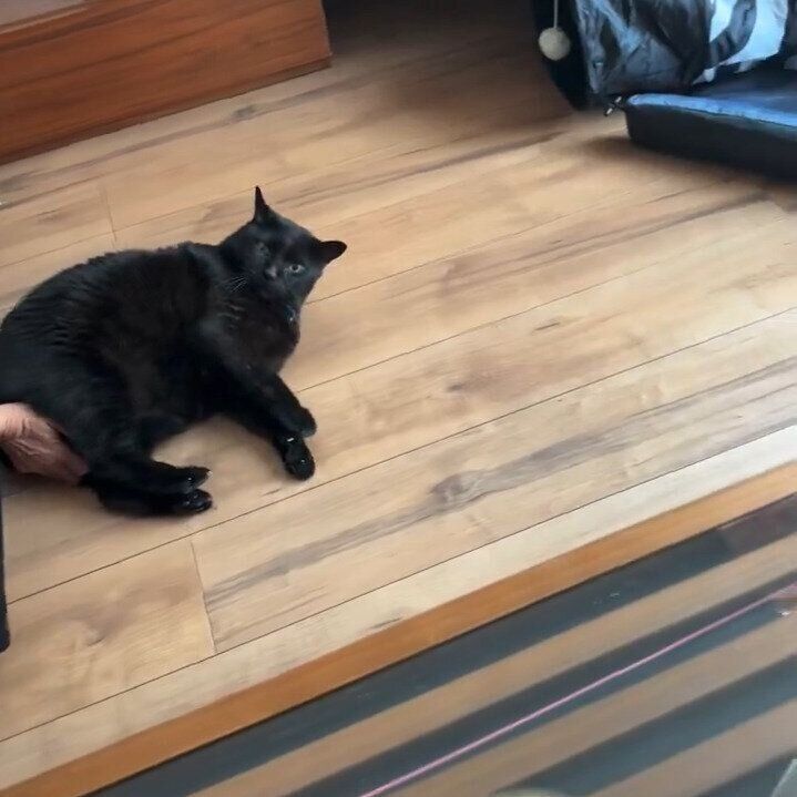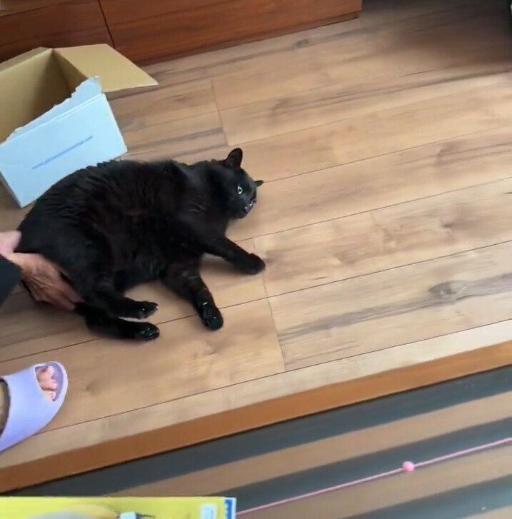 Xユーザーの我が家の黒猫さん(@kuro5696)が床に寝転がる愛猫のクロちゃんを発見。軽い気持ちでちょっかいを出したのですが、その野性を失った姿がゆるすぎて飼い主さんの笑いのツボをつくのでした。4万人が「いいね」したクロちゃんの様子とは?