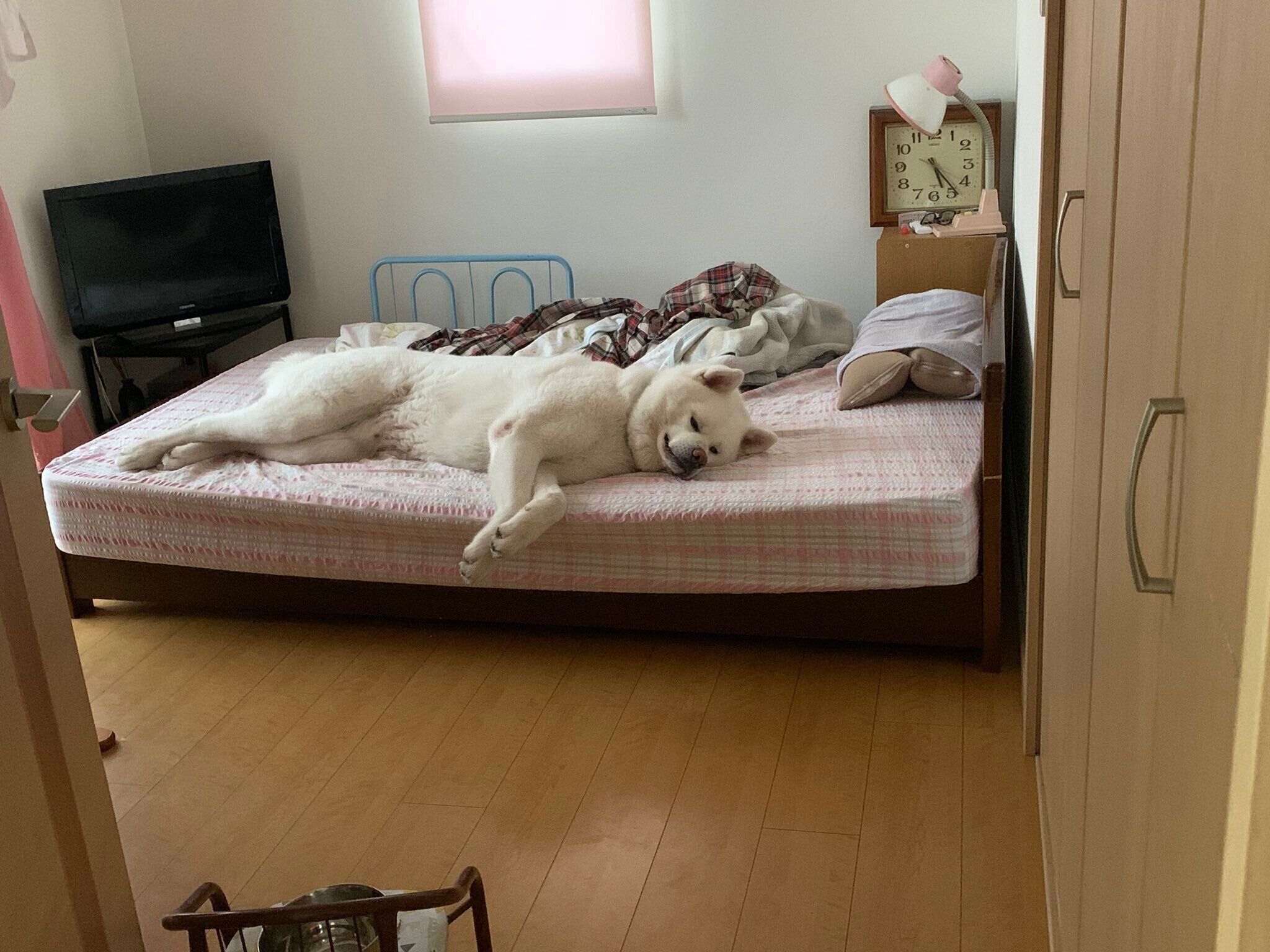 秋田犬と暮らすリカーショップたかはしさん(@Rika__takahashi)がXに投稿したのは、愛犬白岳くんの写真。飼い主さんのベッドに横たわり、気持ちよさそうに眠る姿がまるで人間のようだと話題になり、7.3万件のいいねが寄せられました。