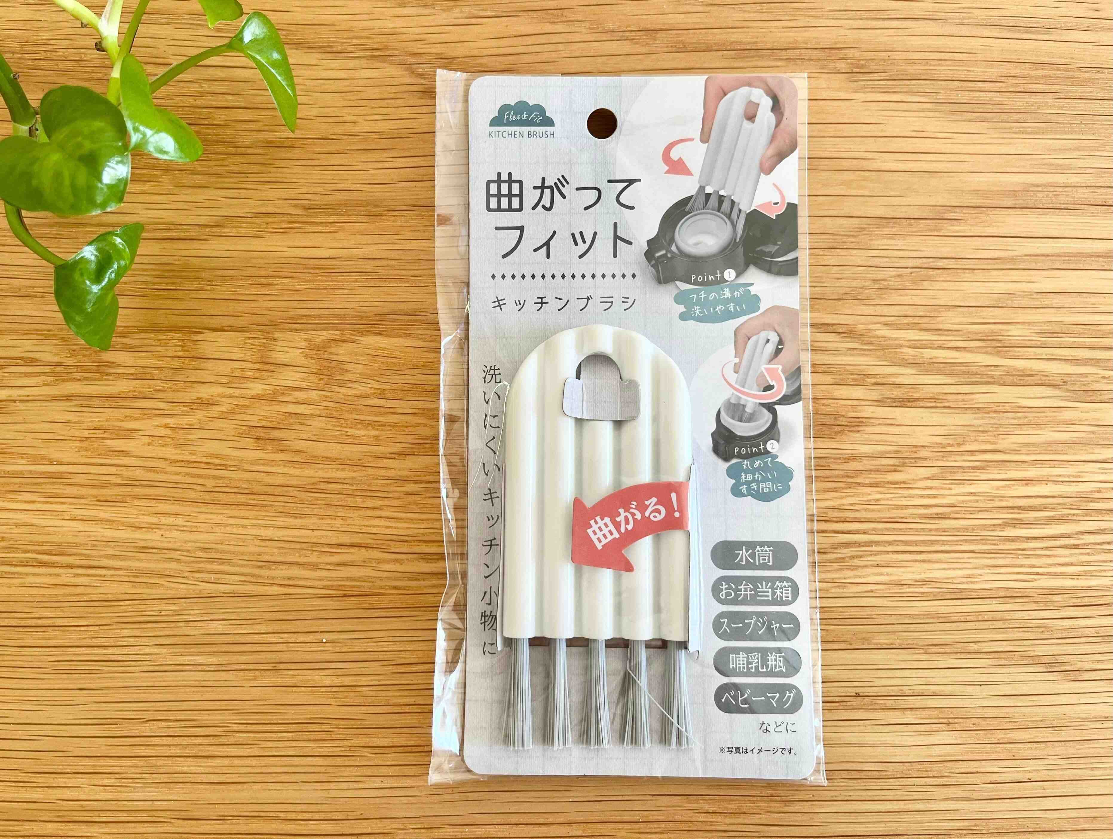 ご紹介するのは、セリアの「曲がってフィット キッチンブラシ」という商品。水筒の蓋やパッキン付きの保存容器、ベビーマグなど、細かい溝やカーブがあって洗いにくいものって結構ありますよね?そんな洗いにくいものを洗う時に大活躍するのが、こちらの商品です。価格は110円で販売されています。