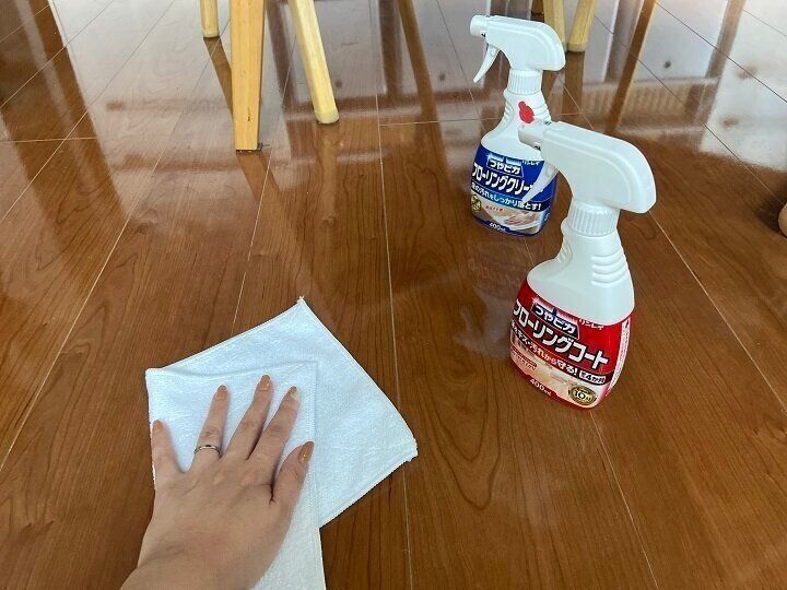 そのあとに使った「つやピカ フローリングコート」は、もともとワックスをかけるということ自体、大変なイメージでしたが、こちらはビックリするほど簡単にすぐできて、拍子抜けしました。乾燥時間も10分と短く、仕上げ拭きもいらないのでラクでしたね。