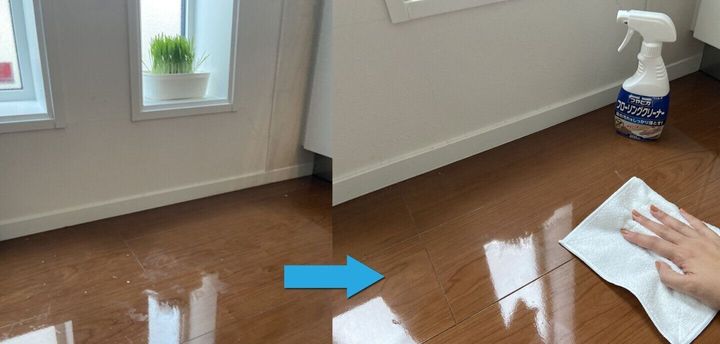 ・スプレーして拭くだけ二度拭き不要! 市販の床用ウエットシートに追加する追いクリーナーもおすすめ。