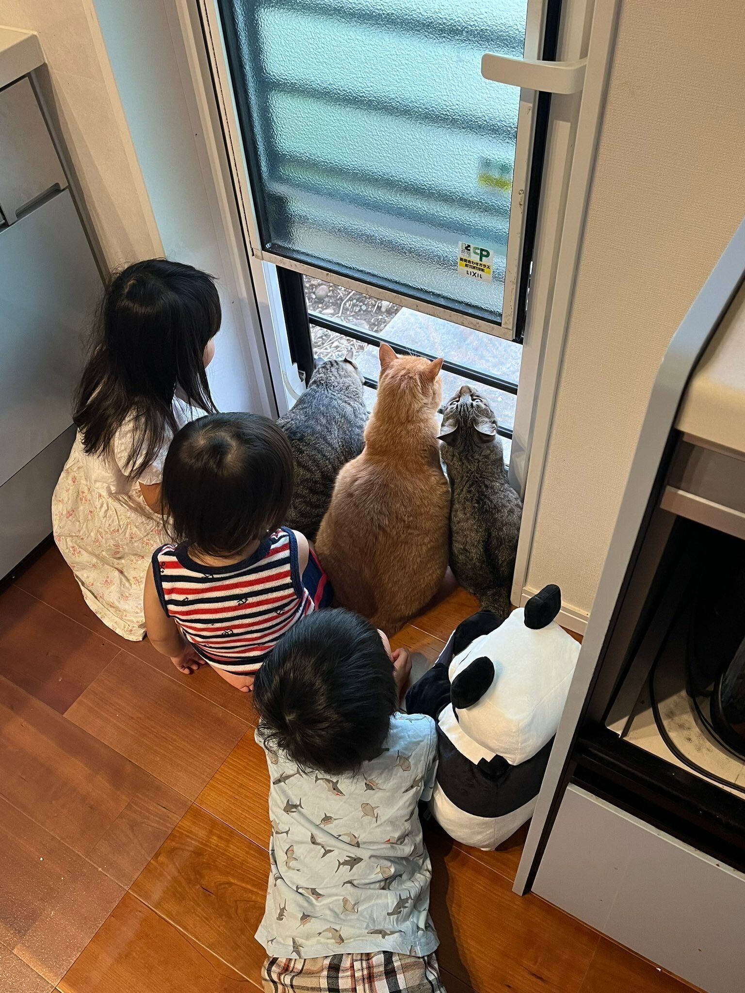今回の投稿以外の場面でも、度々窓の前に集合している様子が紹介されている猫ちゃんとお子さんたち。