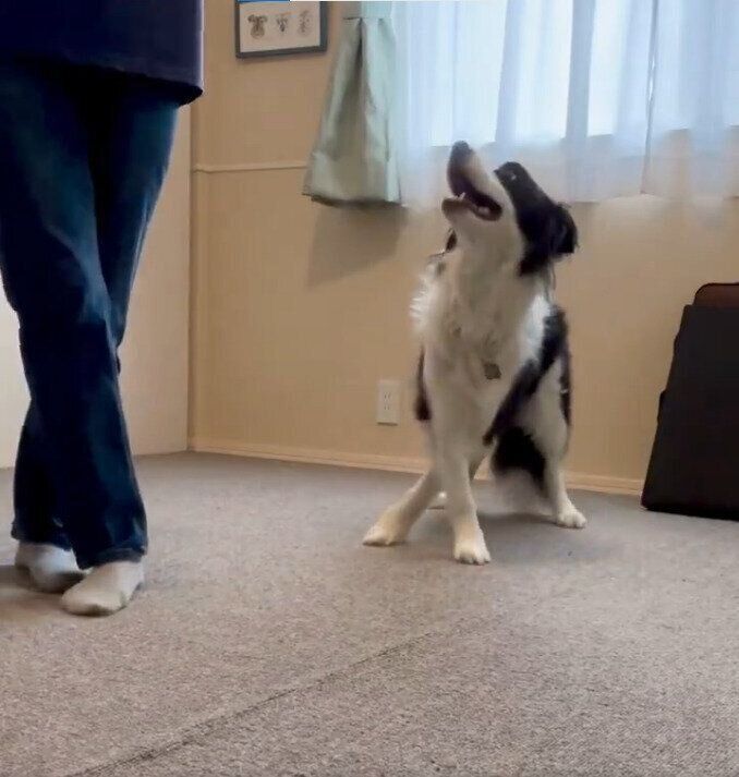 「夏の盛りで暑い日が続いていたので散歩の時間が短くなってしまったため、部屋で遊んだりトレーニングしたりしているところを撮った動画です」