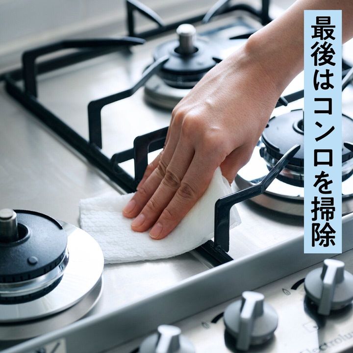 くり返し使った最後は、シンク周りを拭いたり、ガスコンロのギトギト油汚れを掃除して。汚れても、後は捨てるだけだから気にしなくていい。