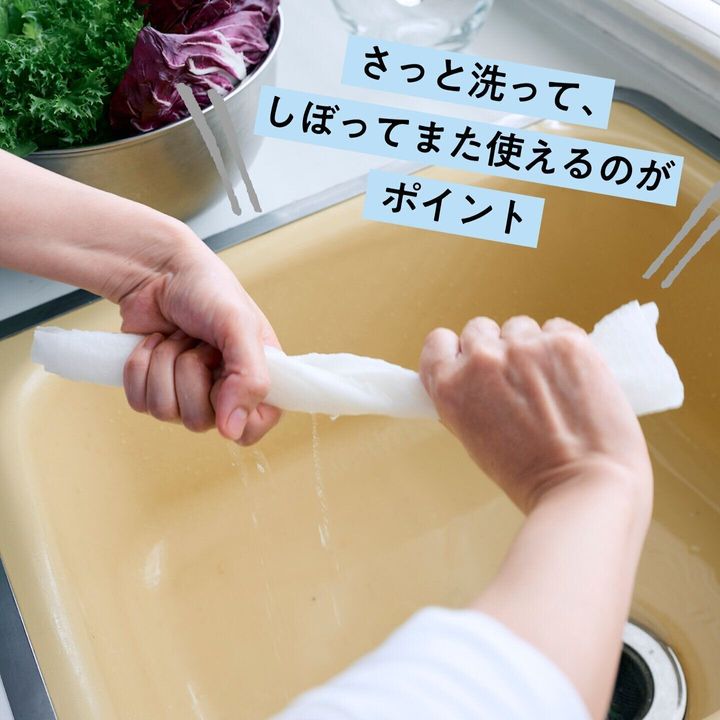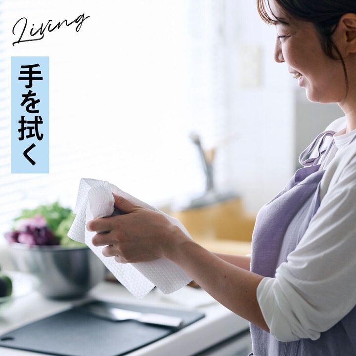 最初は軽く水気を取る布巾やタオル代わりに。最後は台拭きや雑巾代わりに使ってフル活用。使い倒したら後はゴミ箱に捨てるだけ! 布巾よりも手間がかからず衛生的。