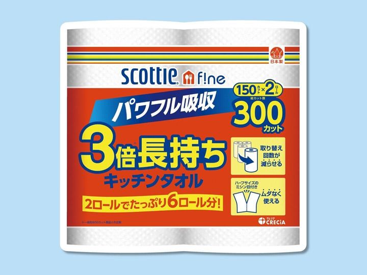 定番のキッチンタオルもより便利に進化中。1ロールが“3倍巻き”だから面倒な取り替えの頻度が減るのもうれしい。少しだけ使いたいときも、通常の半分の大きさでカットできるから、“もったいない”がない。