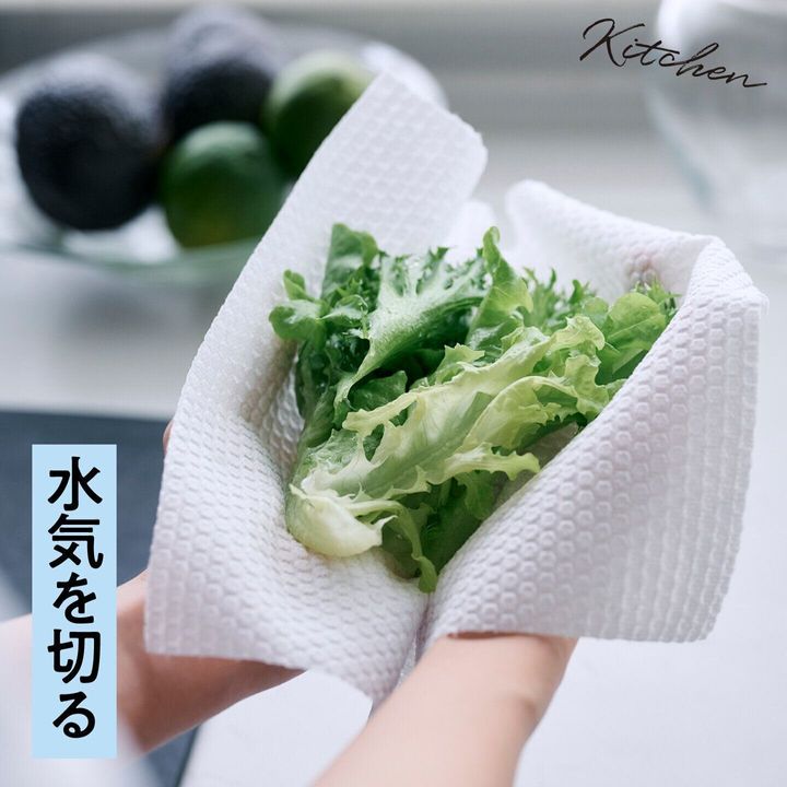 清潔な布巾として、洗ったサラダ菜の水気切りに。吸水性も高いから1枚でしっかり拭き取れる。