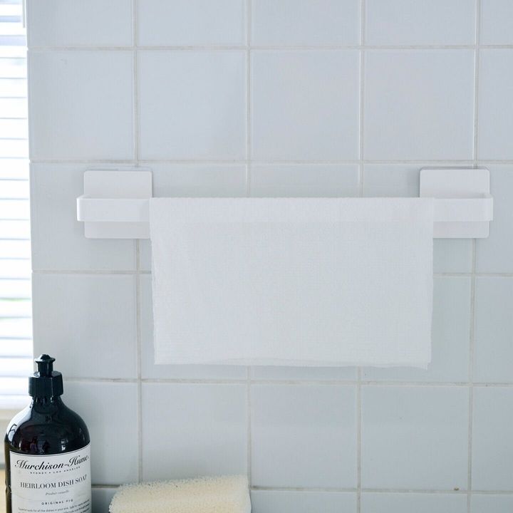 1回使ってすすいだら、タオルハンガーに干して乾かしておく。次に使うときも、さっと手が届いて使い忘れなし。家事も時短に。