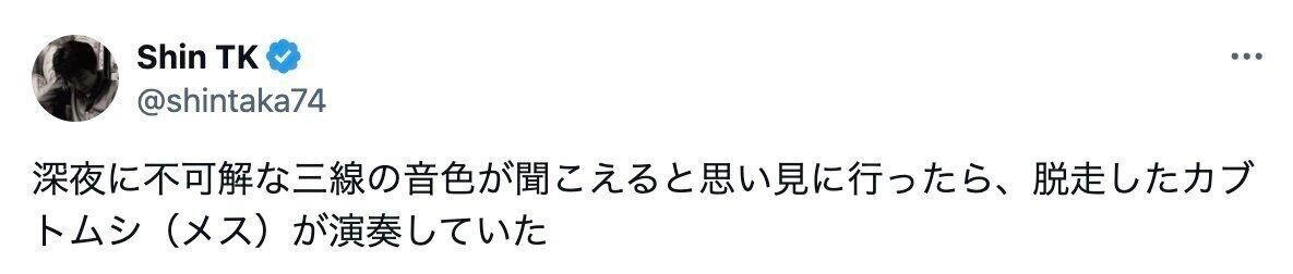 Shin TKさん(@shintaka74)が投稿した写真に、注目が集まっています。投稿したのは、深夜に「不可解な三線の音色」が聞こえてきたときのこと。鳴らしていた意外な犯人に、Xでは「いろんな意味で怖すぎる」と8.2万人が驚きました。