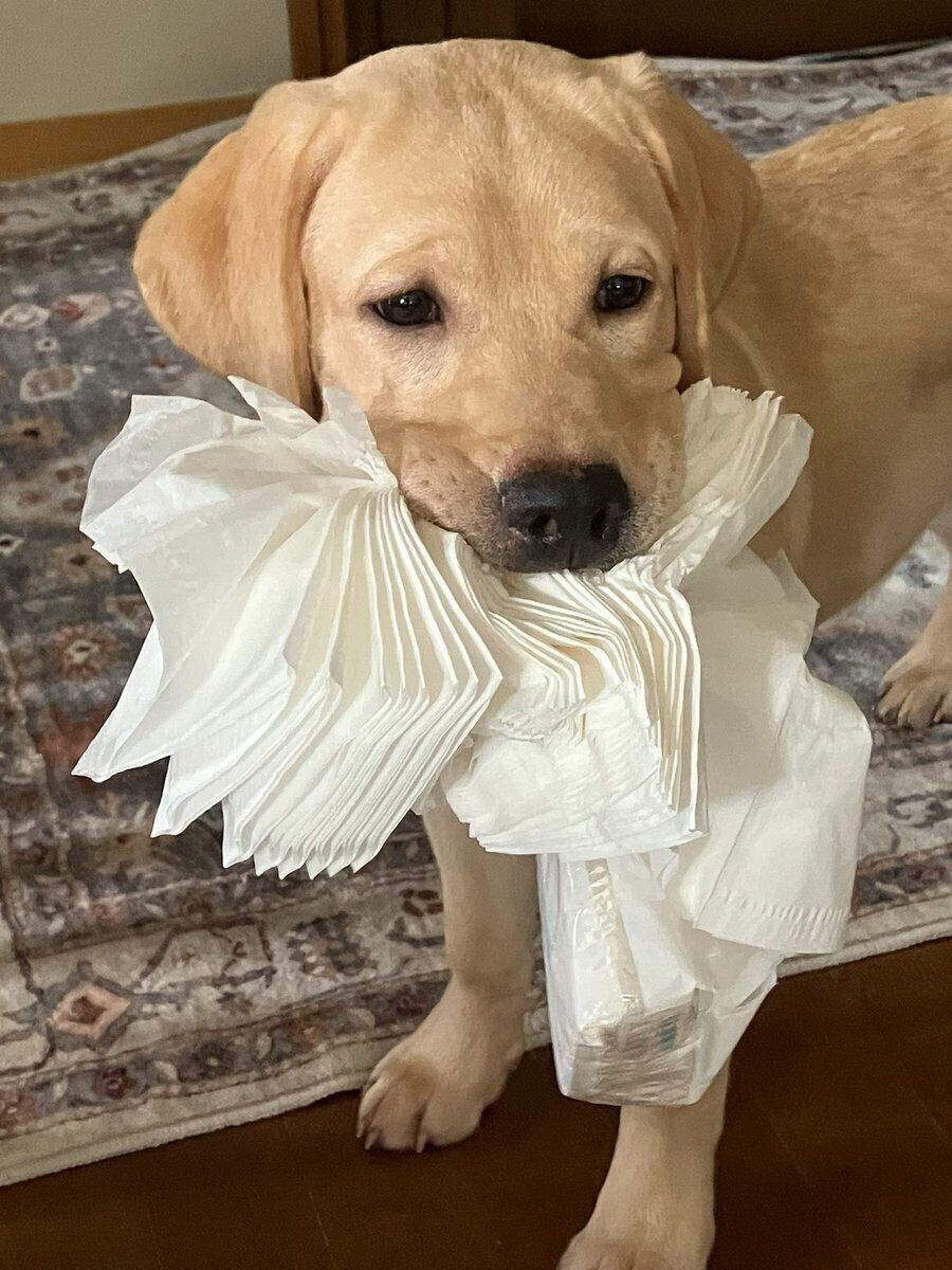 よじちゃんはなんと、ティッシュペーパーを豪快に咥えて遊びに誘ってきたようです。大量のティッシュを咥えている様子にびっくりしてしまいますね。
