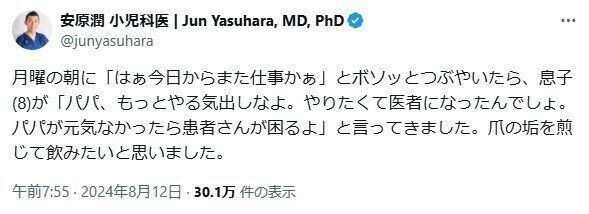 安原潤 小児科医 | Jun Yasuhara, MD, PhDさん(@junyasuhara)が息子さんと”月曜の朝”に交わした会話について投稿しました。思わずつぶやいた「また仕事かぁ」という言葉に対し、返ってきた喝が素晴らしすぎると話題です。