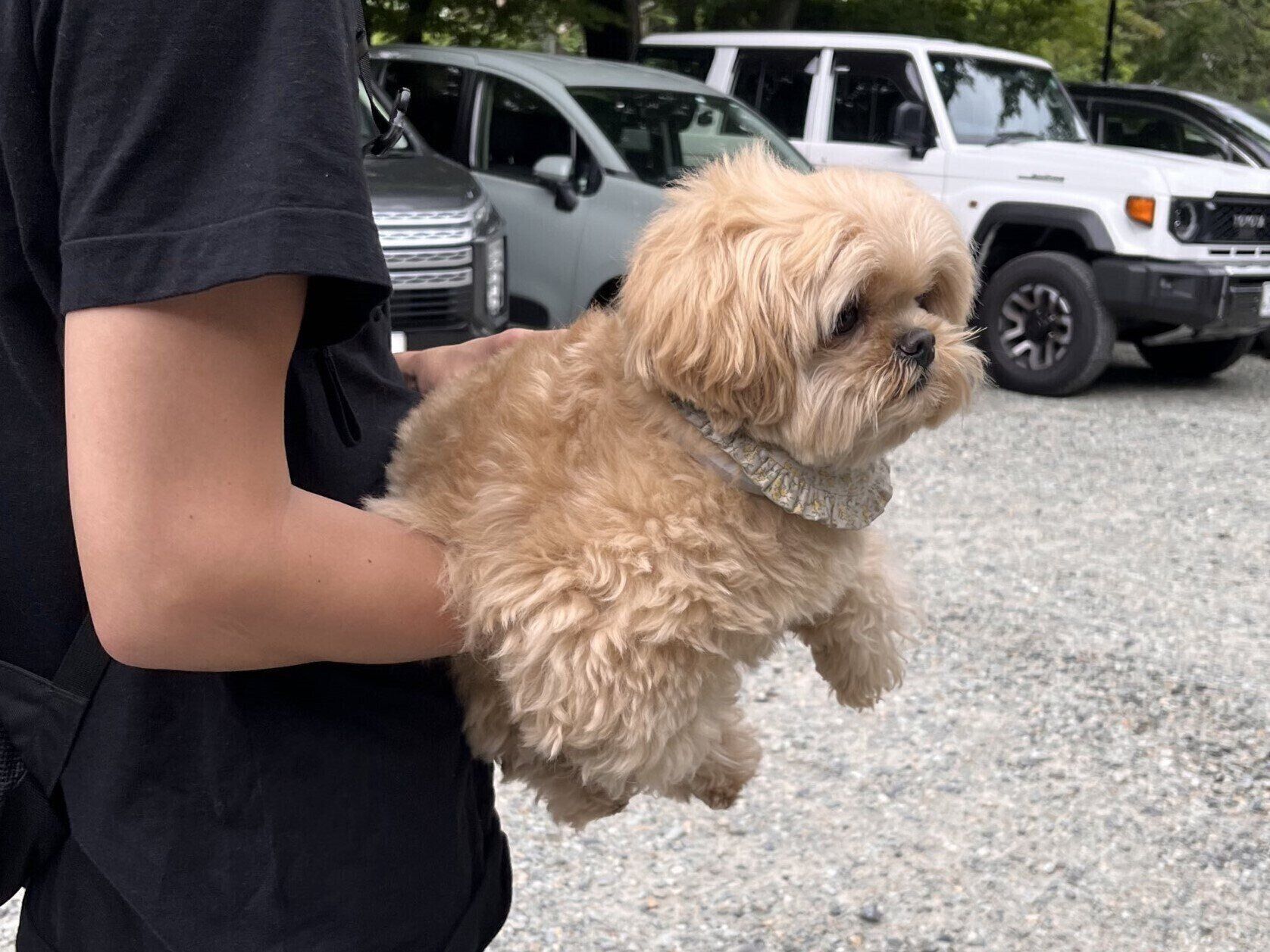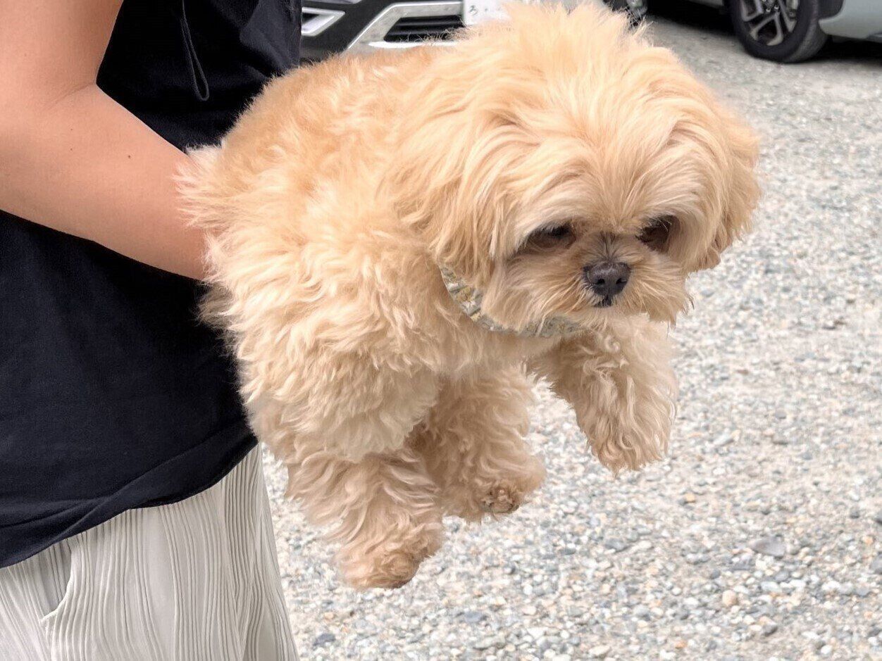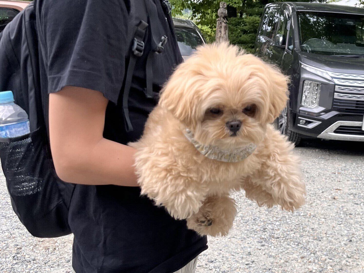 がんもくんさん(@ganmo926_)がXに投稿したのは、愛犬であるペキプーのがんもくんと飼い主さんのお友達のほほ笑ましい場面。お友達ががんもくんを抱っこしましたが、実はワンちゃんに不慣れだったそう。そんな状況が凝縮されているがんもくんの表情に注目です。