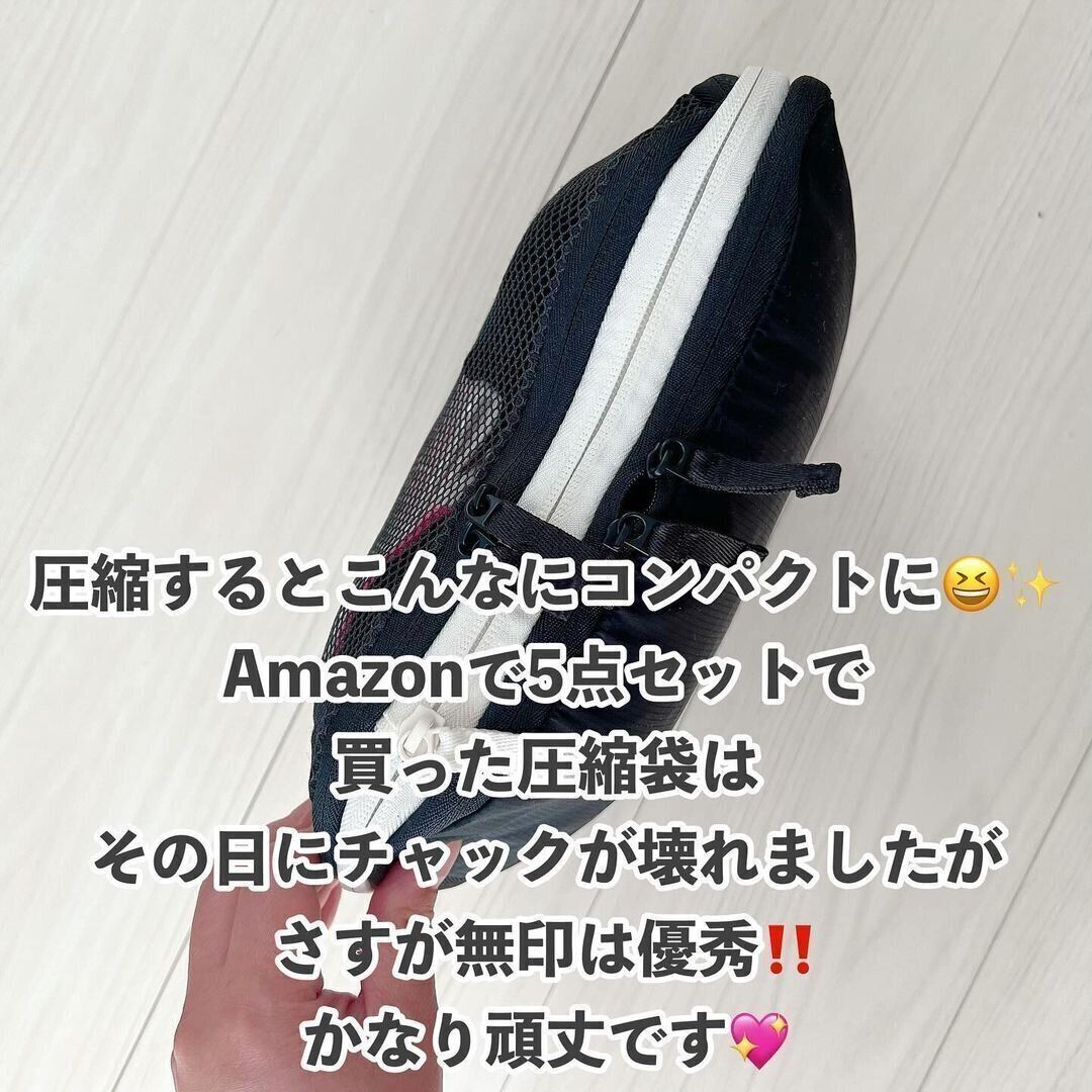 ファスナーを閉めると圧縮されて、とてもコンパクトに。市販品だと壊れやすいものもありますが、このアイテムのファスナーはとても頑丈なため、心配なし。カラーバリエーションは黒とグレーの2色。キャリーケースの中をすっきりさせられて、1度使うともう手放せません!