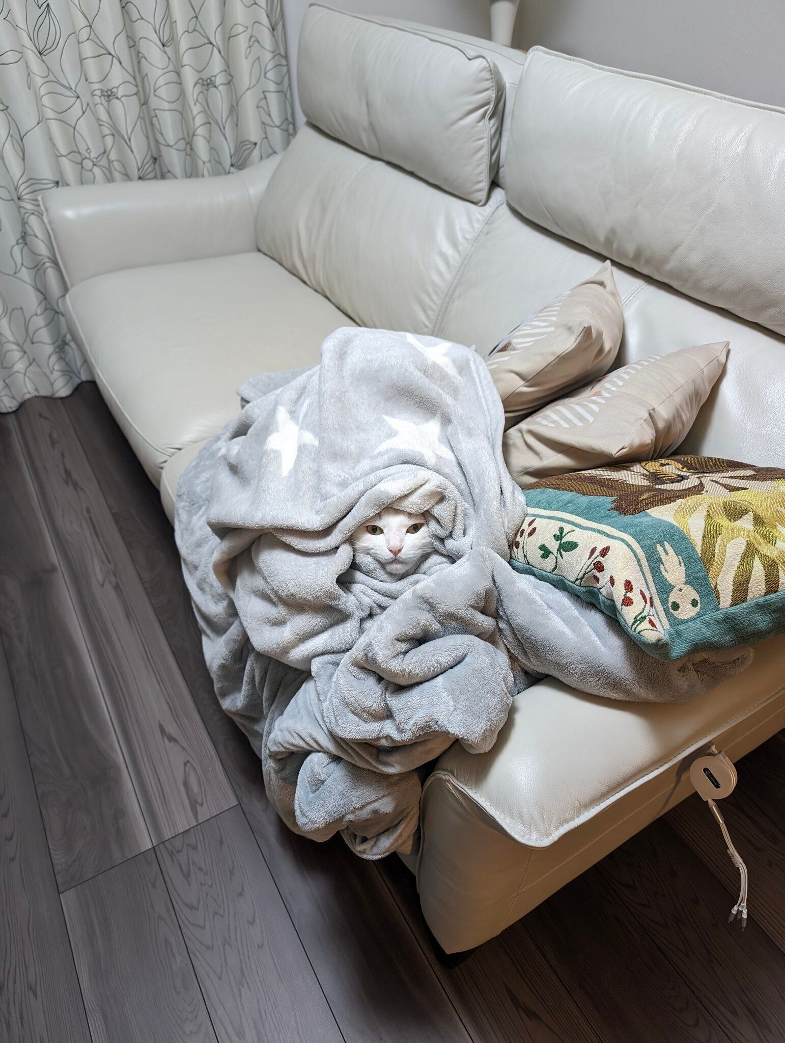 「ハク様がソファの毛布の上で丸まっていたのですが、寒そうだったのでハク様がすっぽり覆われるようにその毛布を被せました。