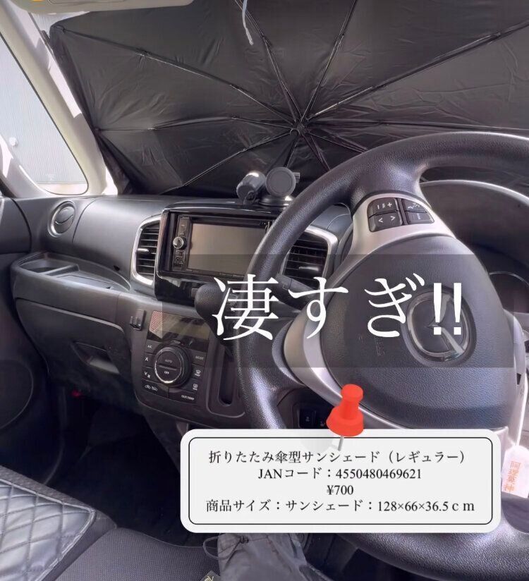 車内での利用は「折りたたみ傘型サンシェード(レギュラー)」(770円)がおすすめ!サンシェードがこの価格で購入できるのもうれしいですが、こちらのアイテムは折りたたみ傘のようにコンパクトになることがポイント。使用しない時は隙間に保管できるので狭い車内では助かります。暑い日は少しでも車内の温度を下げておきたいので、こちらのアイテムを使用して暑さ対策をしましょう。サイズ違いで「折りたたみ傘型サンシェード(ワイド)」(1,100円)もありますよ。