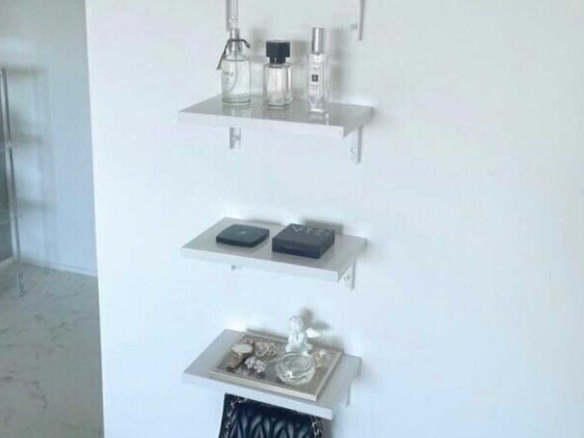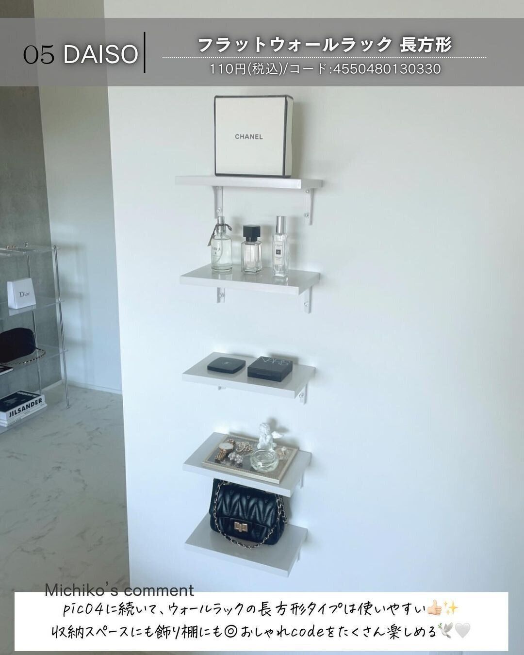 サイズ違いで「フラットウォールラック(25cm×15cm)」(110円)の商品もあるので、飾りたいものによって使い分けることができます。こちらの長方形タイプは、小物や香水などを見せる収納で飾るのがおすすめ!見せる収納は、ハードルが高そうに見えますが、こちらのアイテムを使用すれば気軽に場所をつくることができますよ。