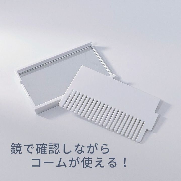 最後はお出かけのときに便利な「ミラーコーム」(110円)。おしゃれなグレーホワイトで、どんな人でも使えそう。仕事のときやお出かけのときにポケットに入れて、身だしなみを整えるときにもおすすめ。ミラーとコームがいっしょになっているのでこれ1つあれば安心。暑い時期はメイクもくずれやすいので、お出かけのときにこれをカバンの中に入れておくのもいいですね。