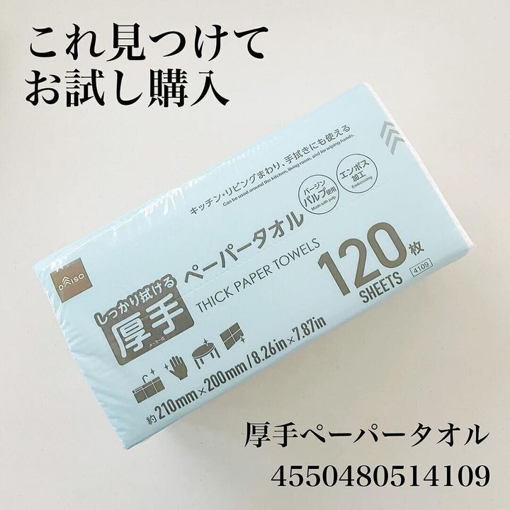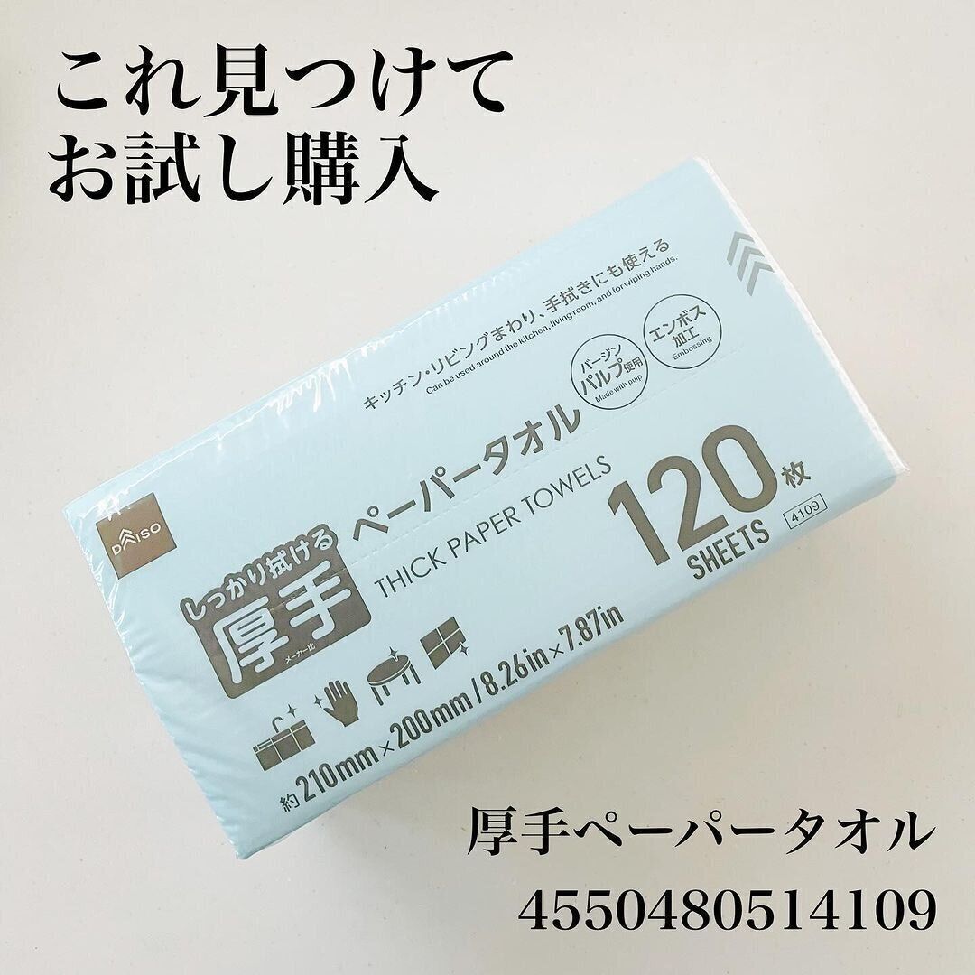 キッチンや水まわりでのおすすめは、これ「厚手ペーパータオル(120枚、210mm×200mm)」(110円)。120枚入ってこの価格はだいぶお得!1枚1円しません。ぬれたものを拭くとき、掃除、手洗い後など用途がたくさんあります。感染病のときに、タオルを共有したくないときにも、これを使えば思わず同じタオルを使ってしまったというミスを防ぐこともできます。