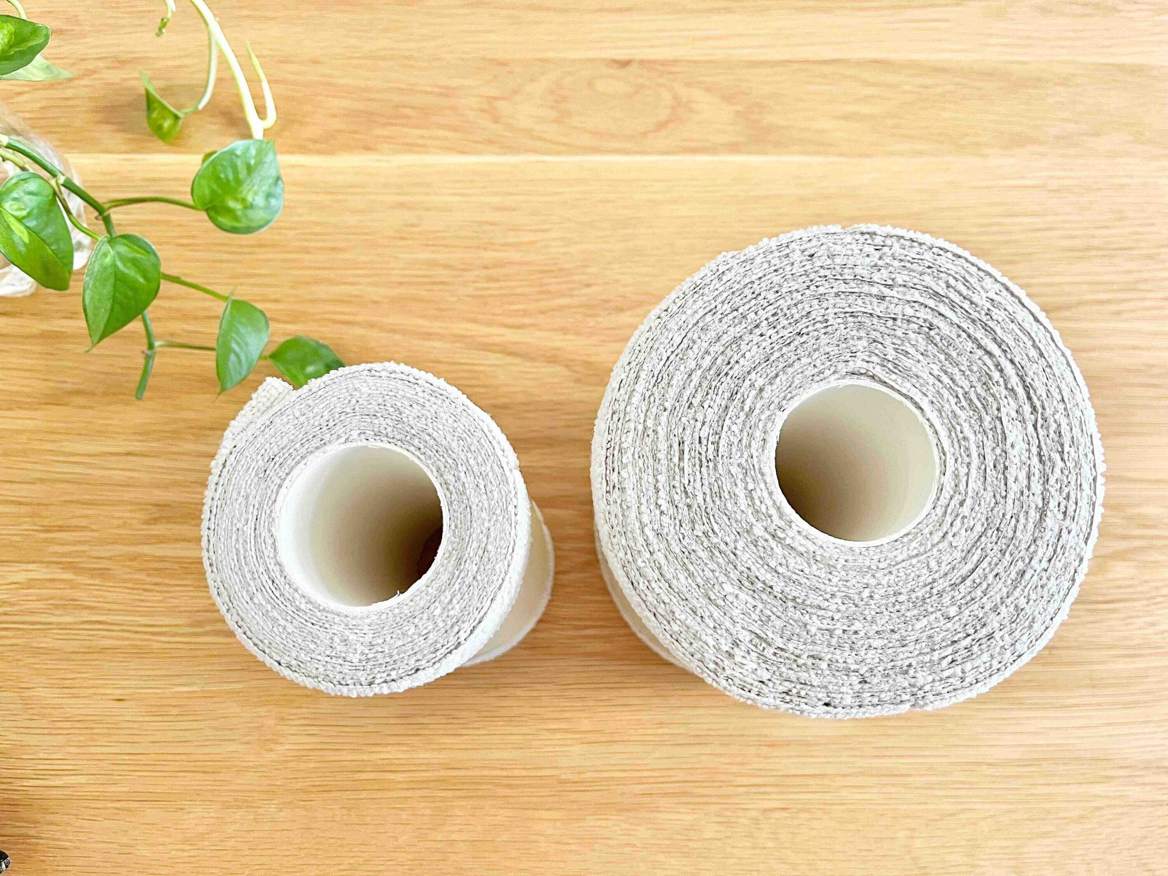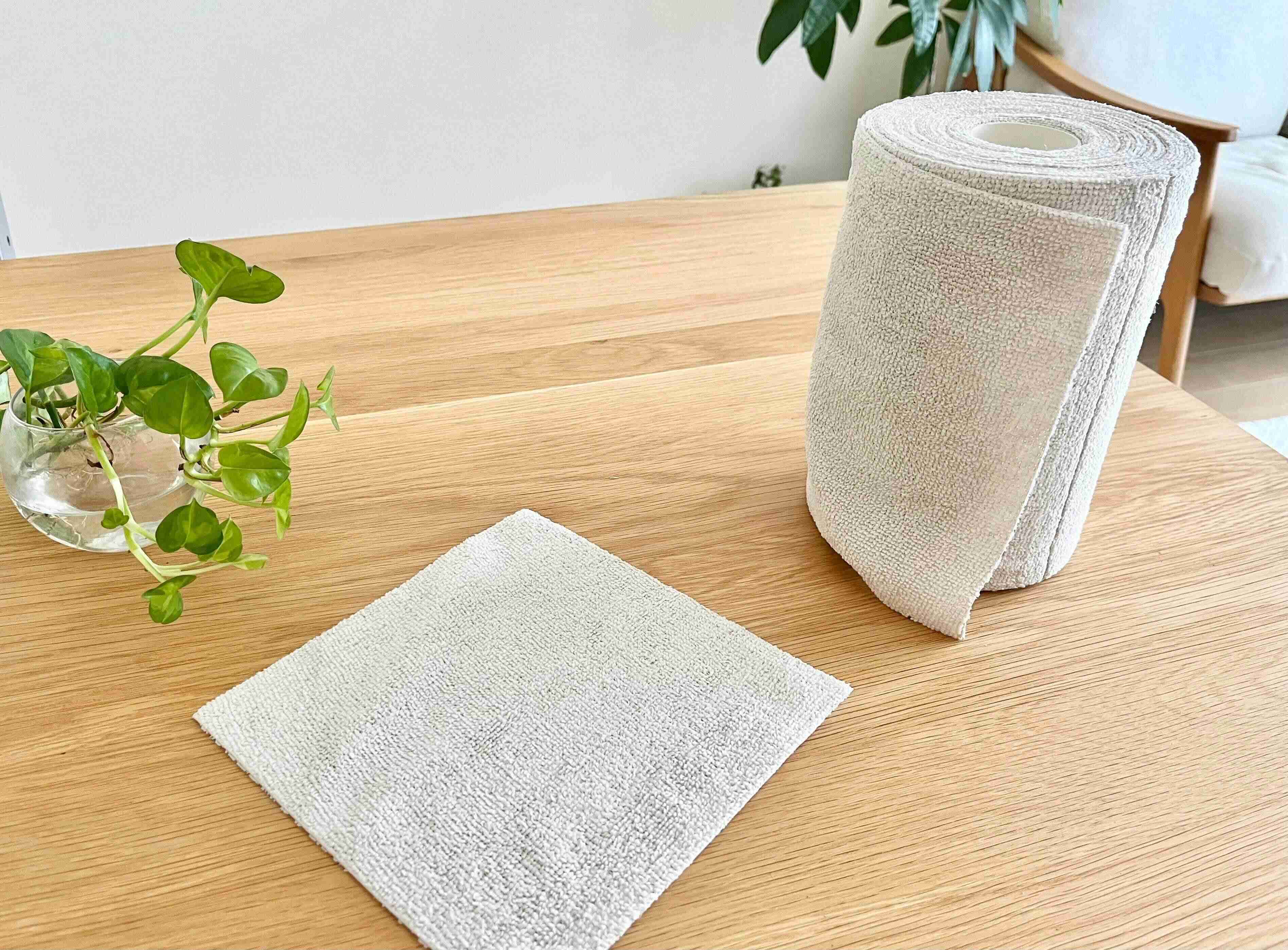大容量シリーズのラインナップの1つである、「マイクロファイバーロールふきん」で通常商品との大きさを比較してみましたが、横に並べてみると一目瞭然!サイズがかなり大きくなったのがわかります。