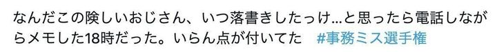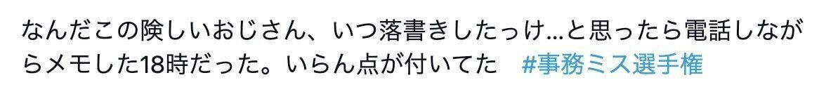 「何かの拍子にメモが出てきたのですが、そのときは書いた記憶が全くないおじさんが出てきて、驚いたのを覚えています。メモの罫線で横書きだと気づき、回転してみたら書いた覚えのある18時になり、さすがにちょっと笑いました。ただ、何が18時だったのかは未だにわからないです(笑)」