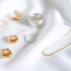 「オレンジムーンストーン」や「パール」、「ホワイトトパーズ」で夏の太陽の輝きを表現したピアスです。ふたつのフープにランダムに留められた石が耳元にさわやかな印象を与えます。