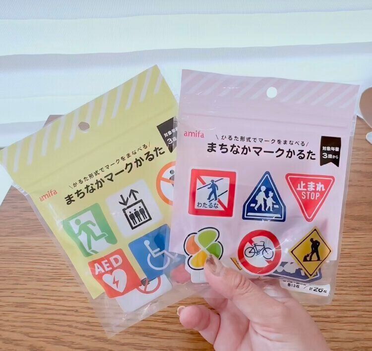 かるたは2種類あり、両方買っても220円なのでまとめ買いしてもよさそうです。家族みんなで、街中のマークについて学んでみませんか。