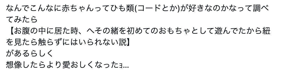 たしかにヒモやコードは、細くて長いへその緒と似ています。赤ちゃんは、お腹の中の心地よさや安心感から、同じようなヒモ状のものを好むのかもしれませんね。