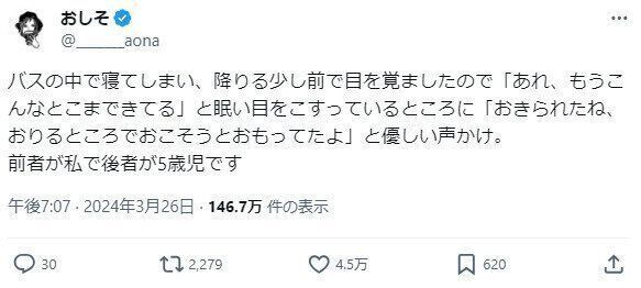 4.5万件以上のいいねを集めたのは、おしそさん(@_______aona)がXに投稿したバスでの出来事です。つかの間の眠りから目覚めたおしそさんを待っていたのは、5歳のお子さんからの、まるで親と子が入れ替わったかのような優しい声掛けでした。