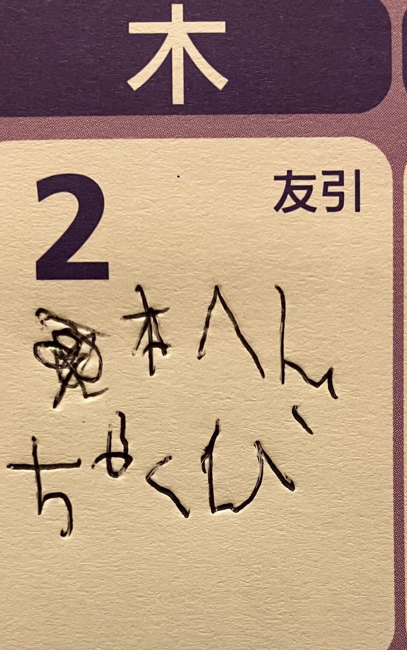 実際にお子さんが書いたカレンダーを見せてもらうと、そこには「本へんちゃくび」のかわいらしい文字が。