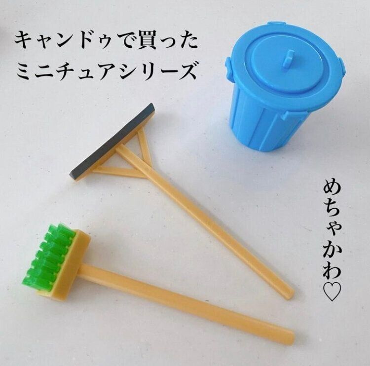 1つずつ個別で販売しているので、ついまとめて大人買いしたくなりそうですね!ひとつだけより、そろって持っているほうがより本物らしく見えて、見栄えもしますよ。投稿写真の「mini おそうじデッキブラシ」「mini水切りトンボ」「miniおそうじゴミばこ」は各110円です。