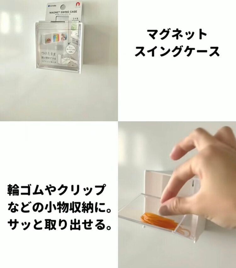 キッチンでも使用頻度の高い輪ゴムは「マグネットスイングケース」(110円)を冷蔵庫につけておけば、いつでも取り出せて便利!見た目が気になる時は、正面ではなくて横側につけておけば少し目立たなくなることもありますよ。色もブラックとホワイトがあるので、冷蔵庫の色に合わせて選ぶことが可能。輪ゴムが色々なところに散らばっているかたは、こちらを使用してみませんか?輪ゴム以外にもクリップなどの小物を入れても便利です。キッチン以外の場所でもマグネットが使用できるところなら使えるので、色々なものを収納できそう。
