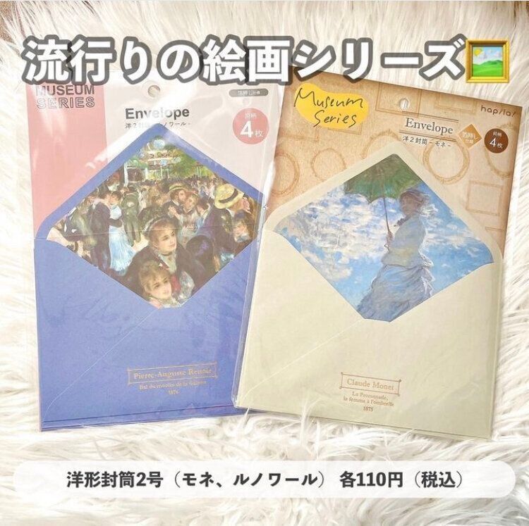 最後は、アート好きなかたには絶対おすすめしたいキャンドゥの「洋形封筒2号(モネ、ルノワール)」(各110円)。こちらはミュージアムシリーズとして、有名絵画のアイテムがいくつか販売されています。他にもゴッホなどあり、自分がアートに興味がなくても、アート好きな友だちにこの封筒を使って手紙を出したくなってしまいますね。
