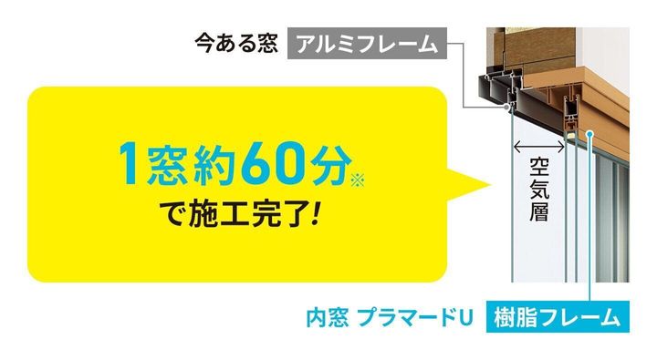 今ある窓の内側に取付けるだけで、暑さ寒さの悩みを解消してくれるのが「内窓 プラマードU」。今ある窓と内窓の間に空気層を作ることで断熱性がアップ。熱を伝えにくい樹脂のフレームで、さらに断熱効果を高めます。