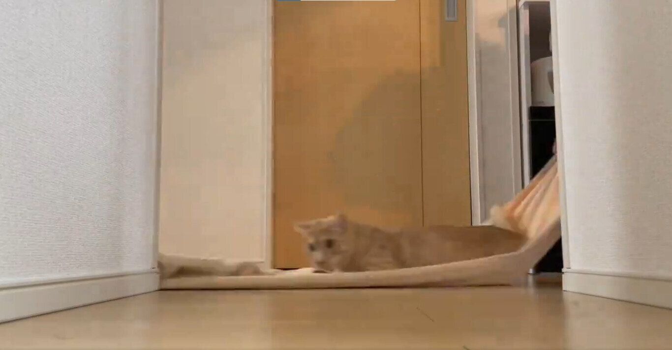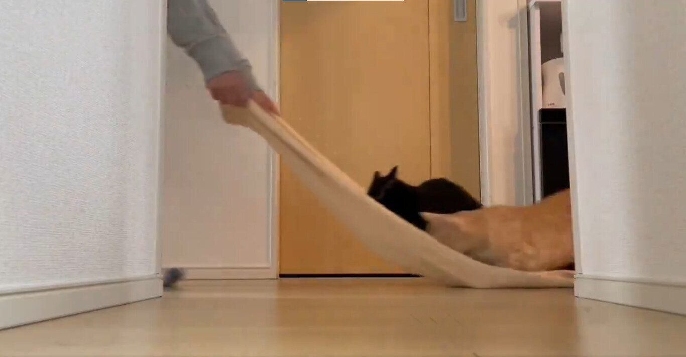 動画には終始家の廊下を行ったり来たりする飼い主さんの様子が映し出されていました。タオルに乗った2匹は振り落とされないように姿勢を低くしながら、爽快感を楽しんでいたようです。