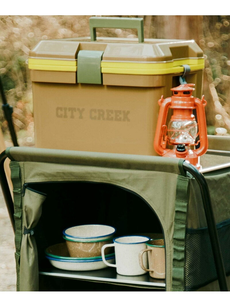 36時間の保冷力を持つ、ソフトクーラーボックス。内部には仕切り板が2枚付属しており、飲み物や食べ物を分けて収納できます。蓋の上部には小窓があり、ファスナーを全開しなくても物の出し入れが可能。冷たい空気が逃げにくく、保冷効果が高まります。本体を囲むように配されたカラナビループは、小物やカップを引っ掛けるのに最適です。