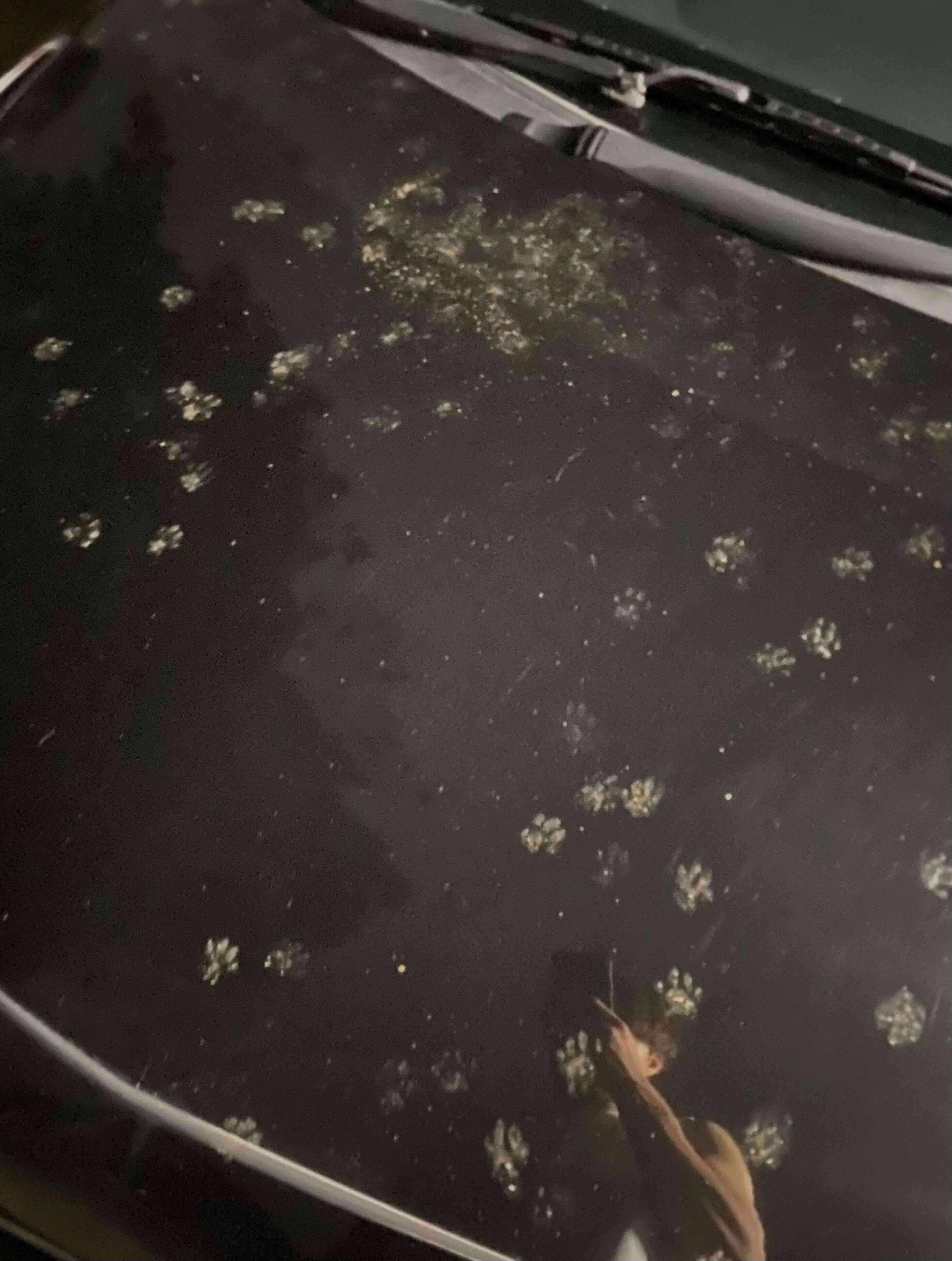 写真を見てみると、黒色のボンネットにはたくさんの白い足跡がついています。