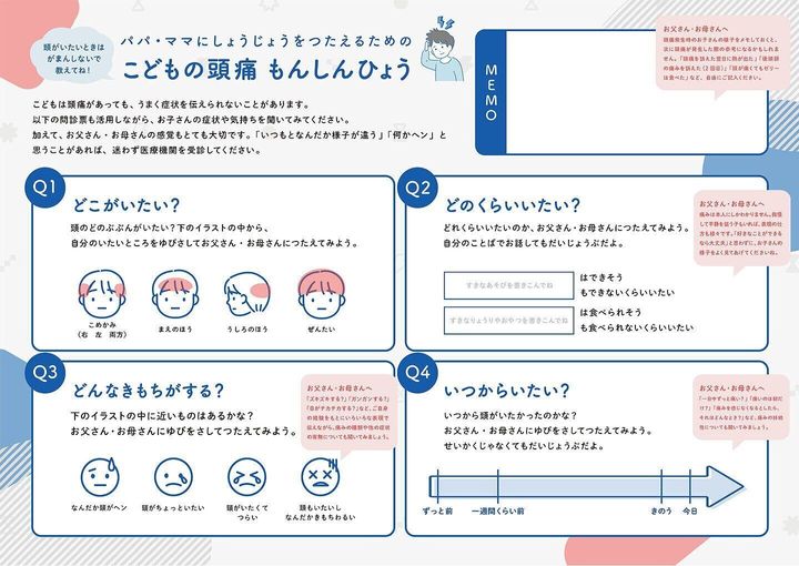 「『こんな症状があったら病院へ』の部分では、頭痛にはほかの病気が潜んでいる可能性もあることを紹介しています。いちばんの理解者であるお父さん・お母さんの、子どもの行動がいつもと違う、おかしいという直感を大事にしてほしいと思っています。また、『学校を休むべき?』では、病院に行きたいか、学校はどうするか、まずは、焦らずお子さんに聞いてみること。登校させる場合は症状や薬の飲み方などを学校の先生と情報共有してください」(楠本さん)