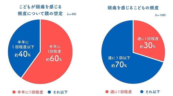 7歳~14歳の子どもで、「頭が痛い、もしくはだるい、重いと感じることがあるか」の質問には約4割が「ある」と回答。頭痛の頻度については、子どもの約30%が「週に1回程度頭痛がある」と回答。一方、親に、子どもがどのくらい頭痛を感じていると思うかを聞いた質問では、親の約60%が「半年に1回程度」と回答。(※) 子どもの頭痛頻度と親が思う子どもの頭痛頻度には大きな開きがあることが見えてきました。