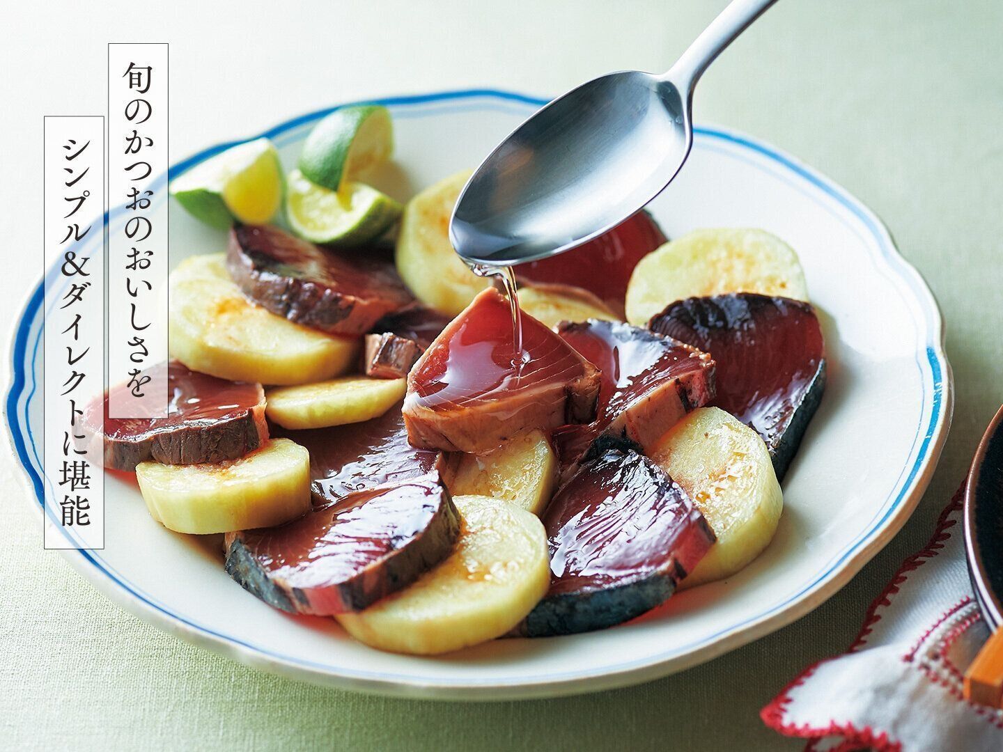 2.かつおのたたきは食べやすく切り、1とともに皿に並べる。
