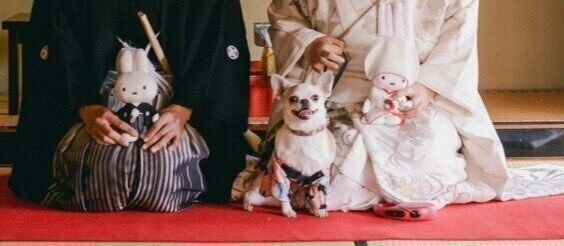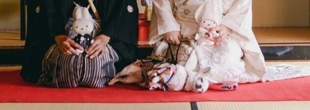 イッヌさん(@05_omm)が投稿したのは愛犬・おまめちゃんと一緒に撮影したウェディングフォト。飼い主さん夫婦と同じく着物に身を包みかわいらしく着飾ったおまめちゃんでしたが、「やる気なし」写真でも魅力をたっぷり発揮していました。