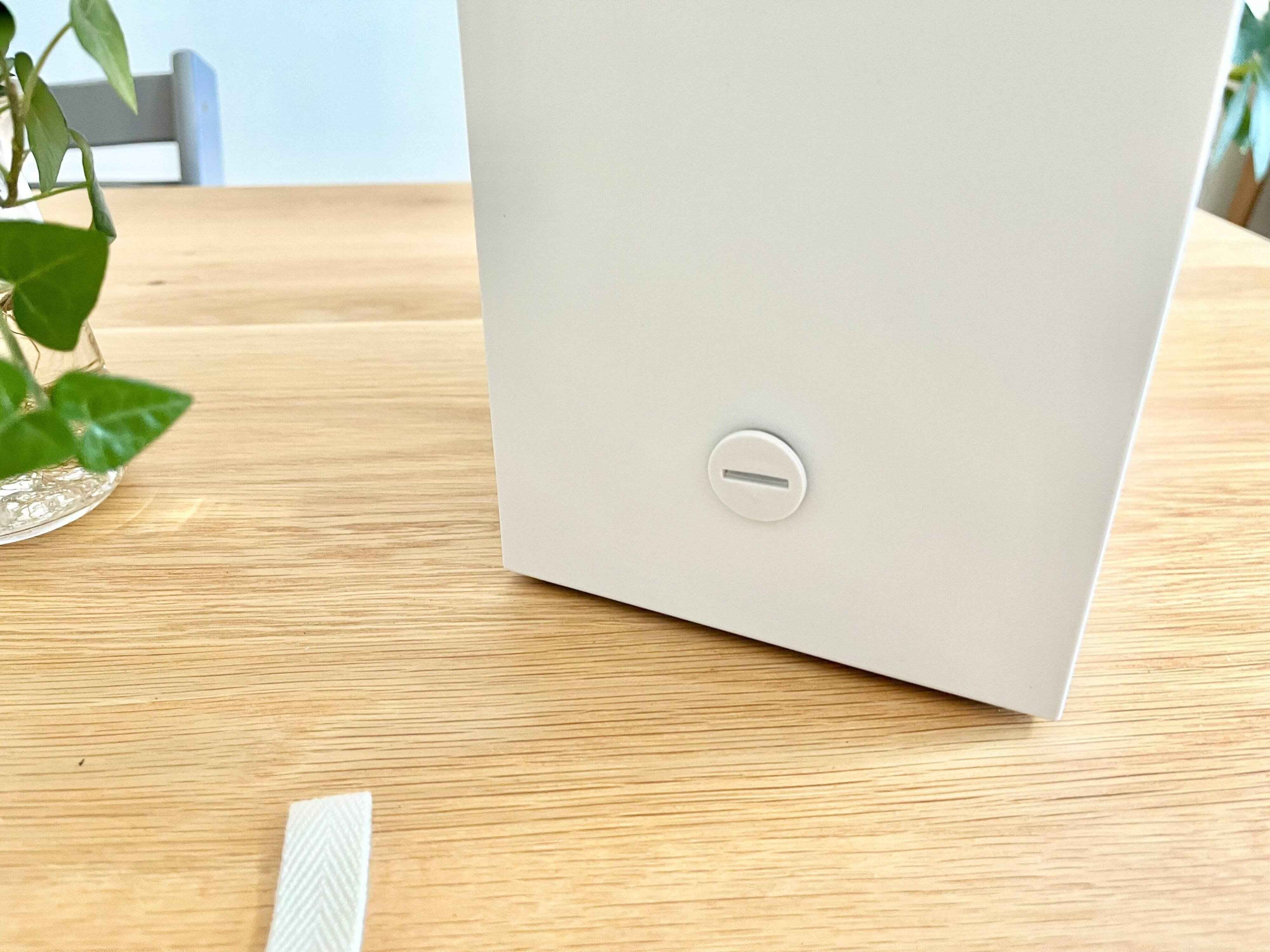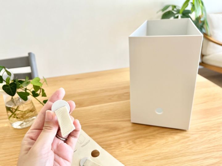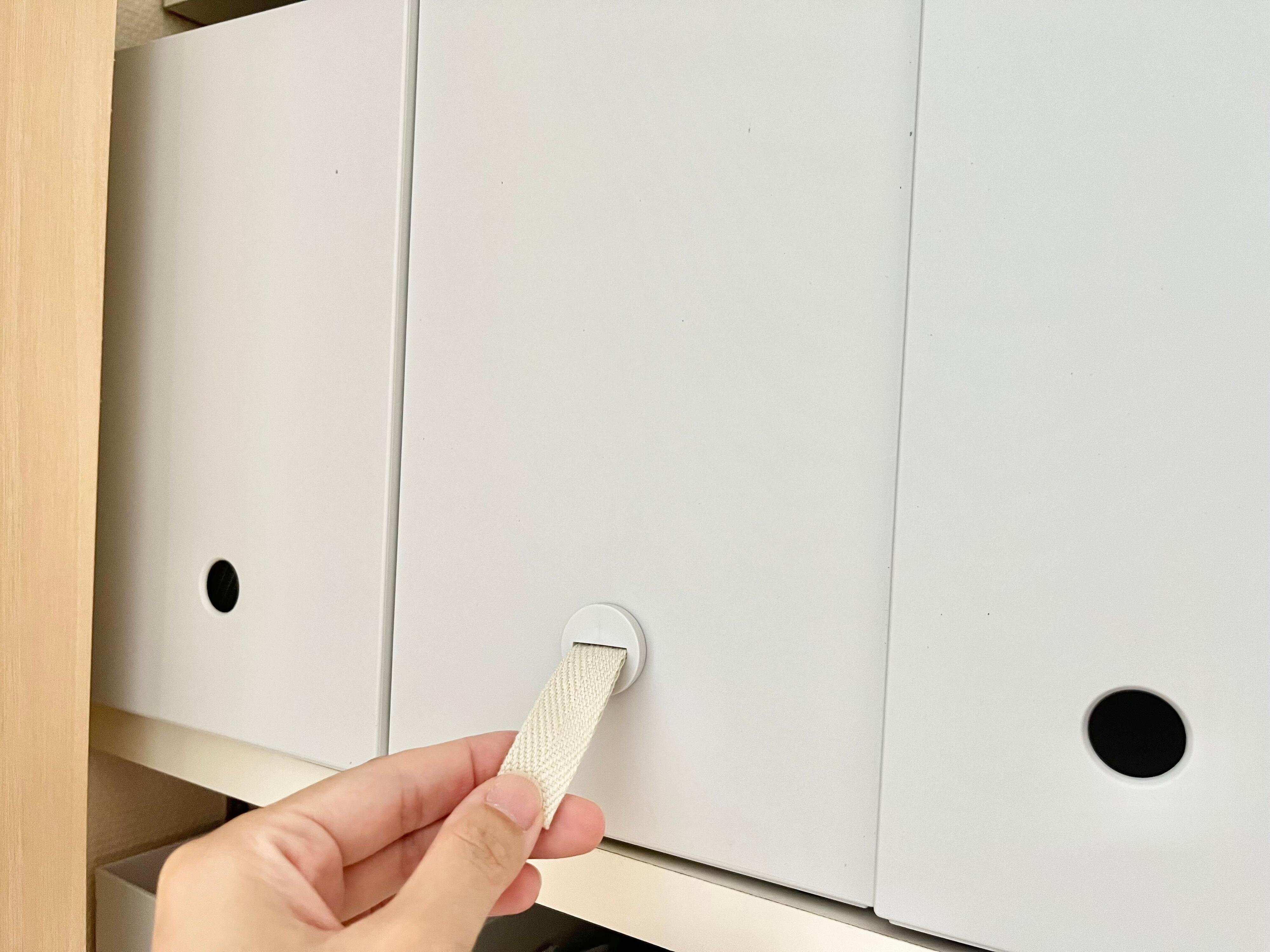 そして付属のテープを「ポリプロピレンファイルボックス」の内側からつまみにある穴に取り付け、残りのパーツを「ポリプロピレンファイルボックス」の内側から固定するだけ完成です。ちなみに、繰り返し使用できる商品ではないので、ご注意くださいね。