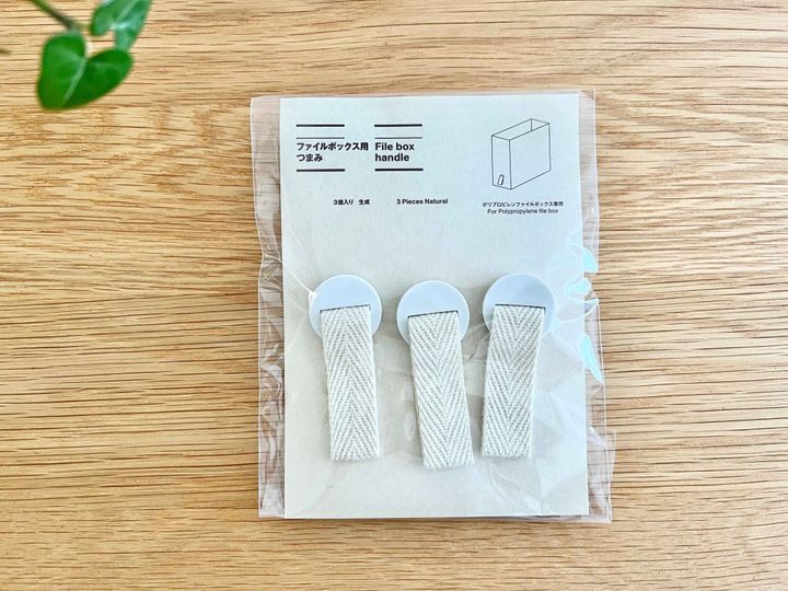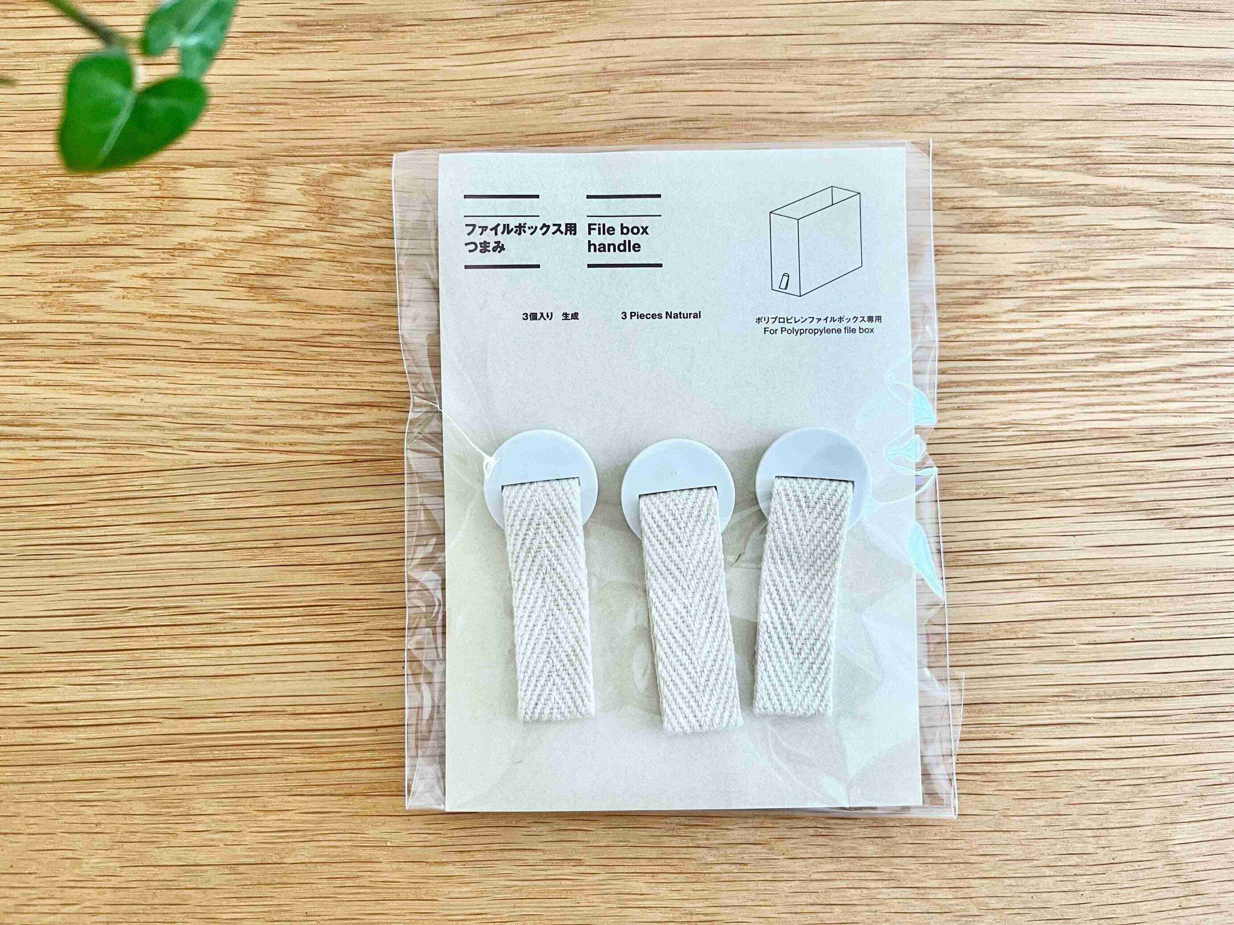 ご紹介するのは無印良品の、「ファイルボックス用つまみ」。無印良品の「ポリプロピレンファイルボックス」専用の商品です。3個入り390円で販売されています。