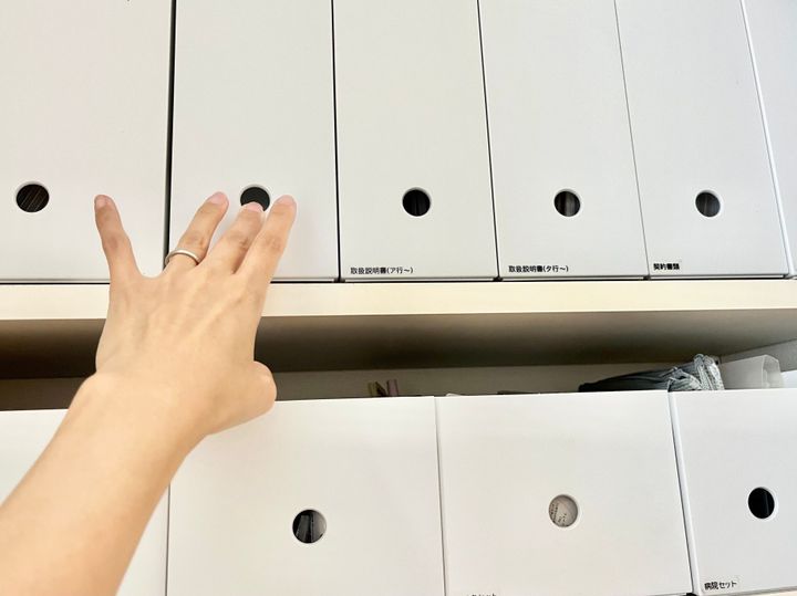 「ポリプロピレンファイルボックス」につまみが付いたことで、少し高い場所に置いても手が届きやすくなり、引き出しやすくなりました!つまみのテープ部分はアクリル製で柔らかいので、「ポリプロピレンファイルボックス」に傷が付きにくいのもうれしいですよね。